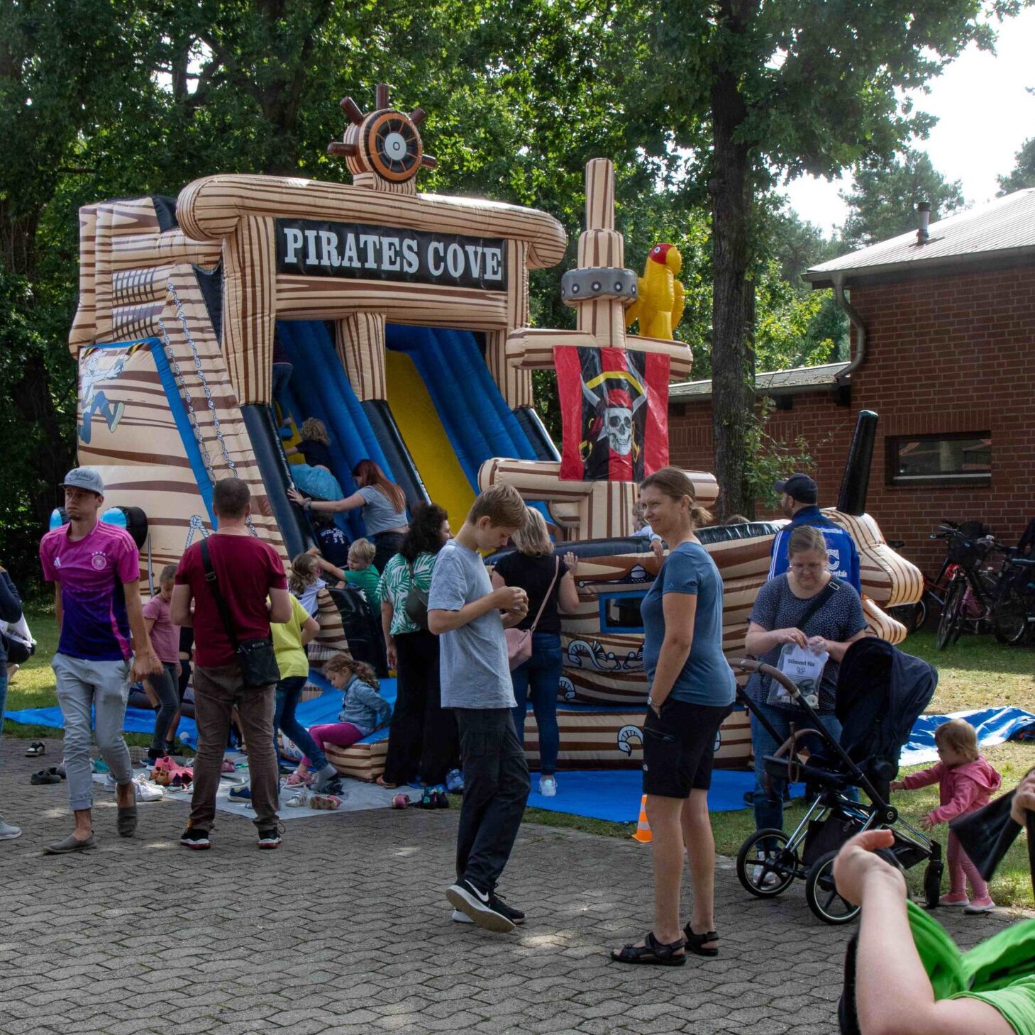 Es wurde ein riesiges Piratenschiff (Hüpfburg) geentert und alle begaben sich auf die begehrte Schatzsuche. Die Kinder konnten Piratenschiffe aus Holz gestalten und testen, ob diese im Wasser schwimmen. Wer wollte ließ sich ein oder mehrere Tattoos aufkleben. Außerdem wurden die kleinen Piraten mit selbstgebastelten Augenklappen ausgestattet. Große Begeisterung gab es auch bei der coolen Piratendisco mit Emelie. Die Muttis vom Kinderturnen versorgten uns mit leckerem Kuchen und Waffeln, sowie der Feuerwehrförderverein mit leckerer Bratwurst und Pommes. Und wem das zu heiß wurde, holte sich ein Eis von den Milchburschen.