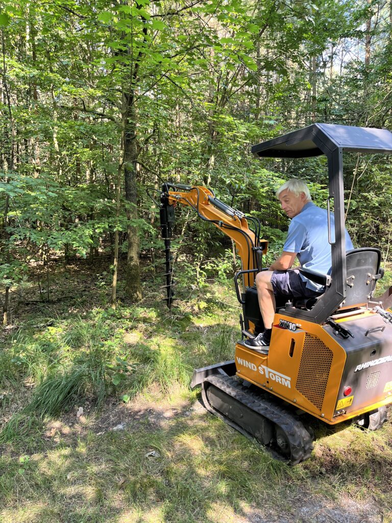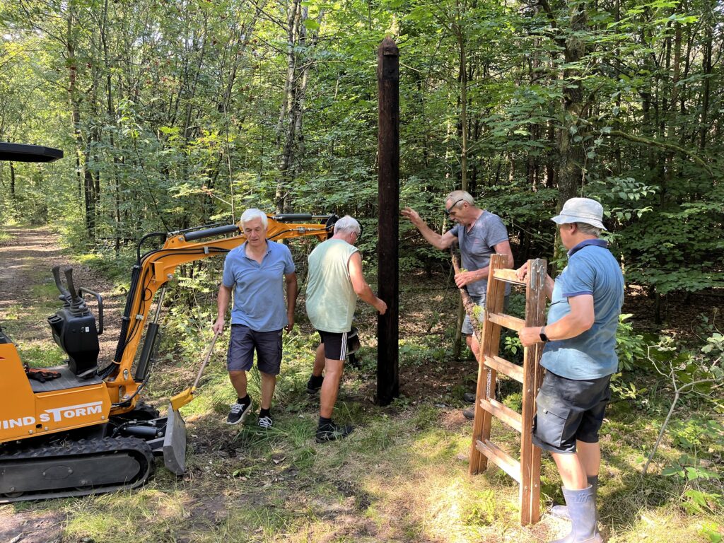 Zurück im Wald wurde an optimaler Position ein Loch gebohrt und der Pfahl eingesetzt. Er trägt jetzt ein neues Schild, das Joachim aus einer Eichenbohle gefräst hat und wird damit viele Jahre lang den Besuchern den richtigen Weg weisen.