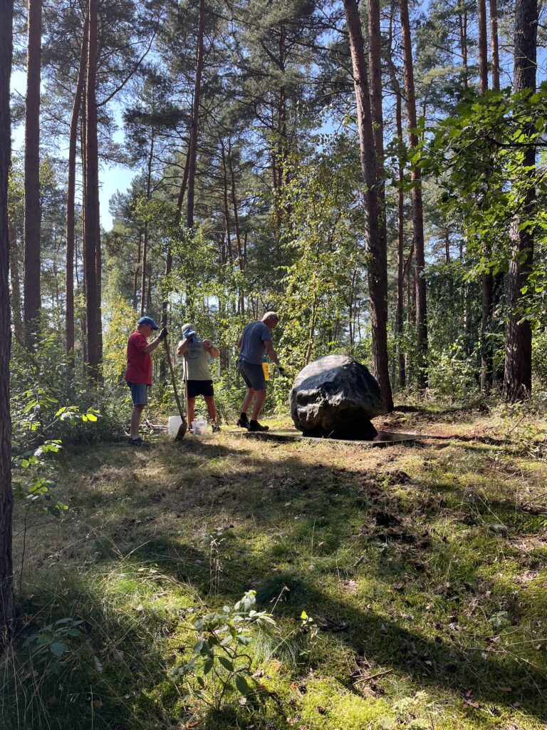 Während eine Gruppe den Findling fachmännisch und schonend reinigte und das Unkraut rings um den Stein beseitigte, zogen die anderen den am Waldpfad befindlichen Pfahl mit dem Hinweisschild aus dem Boden.
