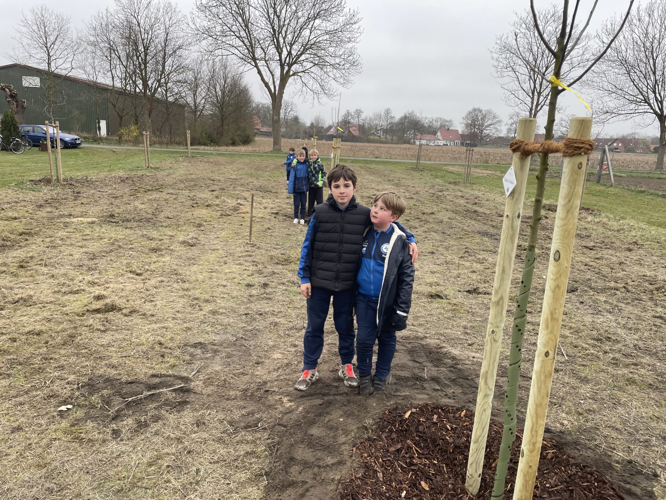 Schutz im Winter vor Frostschäden und Wildverbiss, haben die Kinder mit ihrem