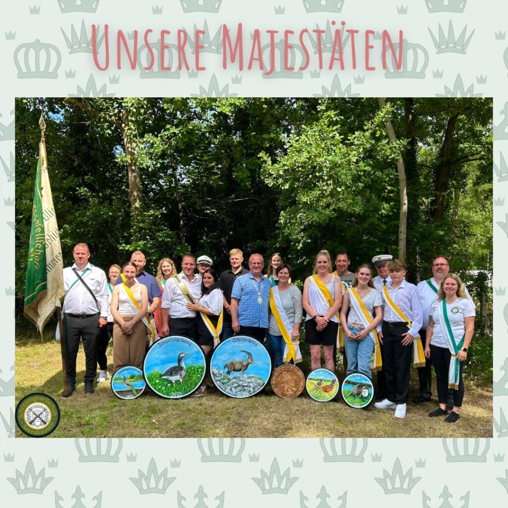 Wir gratulieren herzlich unseren neuen Majestäten: 👑 Kinderkönig: Lotta Weidmann (außen rechts) 👑 Jungschützenkönigin: Lilly Schrader (außen links) 👑 Jungschützenkönig: Daniel Homann (zweiter v.l) 👑 Damenkönigin: Ilka Zander (zweite v.r) 👑 Großer König: Uwe Weidmann (Mitte)