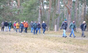 Im weiteren Verlauf passierten die Wanderer den Sonnekamp und die Nurda-Siedlung, um entlang des Bahndamms in Richtung Volkser Straße zu gelangen. Bevor diese erreicht wurde, verweilte die Gruppe noch für eine kurze Pause im Wald neben der Bahntrasse.